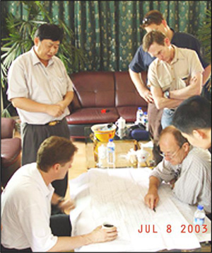 ![]() Robert Friedland (sitting on left) and Chen Jinghe (standing on left) review a mineral prospects map in 2003. |