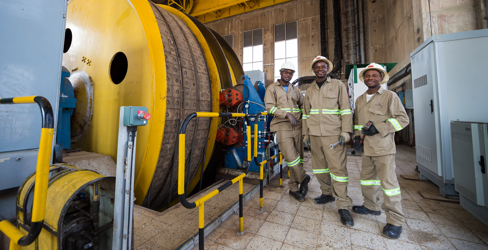 KICO team members at Kipushi’s Shaft 5 hoist winder. |