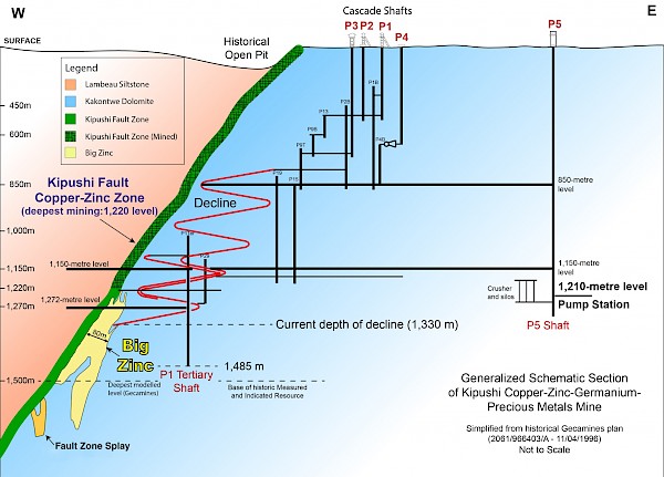 Most of Kipushi’s historical production was from the Fault Zone, a steeply-dipping ore body rich in copper and zinc that initially was mined as an open pit. The Fault Zone extends to a depth of at least 1,800 metres below surface, along the intersection of a fault in carbonaceous dolomites (see Figure 2).The founding era of mining at Kipushi ended in 1993, when it was placed on care and maintenance due to a combination of economic and political factors.