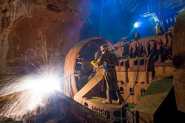 Welding on the underground rock crusher at the bottom of Shaft 5 that is being
