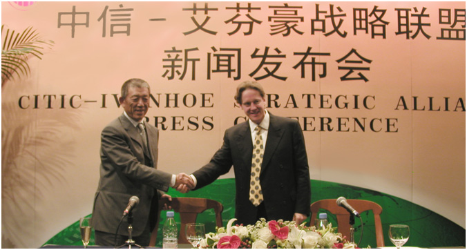 ABOVE: April 23, 2003 – Ivanhoe Mines Chairman Robert Friedland and the then CITIC Group Chairman Wang Jun (left) announce the formation of a strategic alliance to pursue mutual mineral exploration, development and production interests.