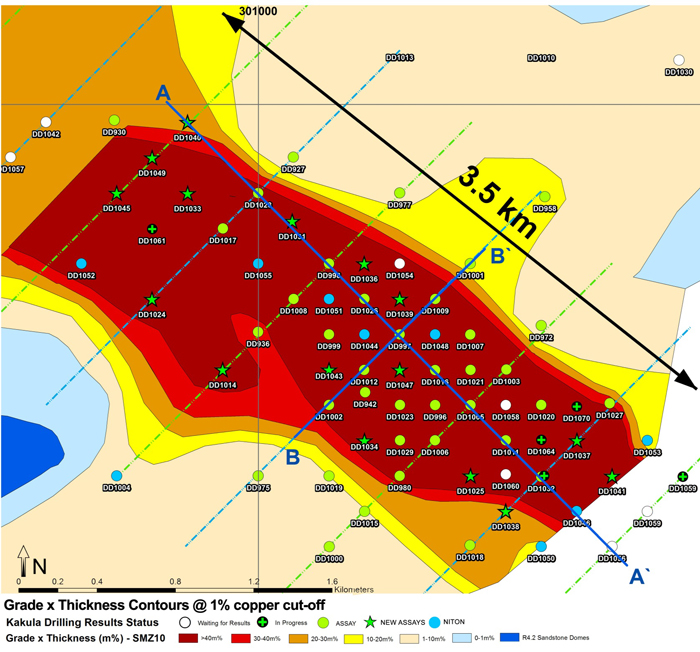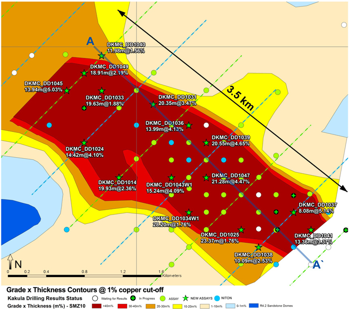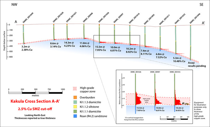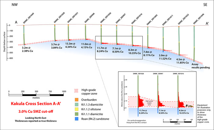 Figure 10. New cross-section A-A’ of Kakula Discovery area, showing true thicknesses of drill intercepts at a 3.0% copper cut-off.