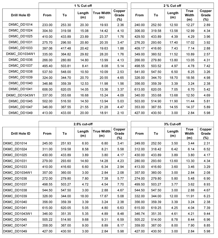 • DD1024 intersected 6.14 metres (true width) of 6.52% copper at a 3.0% copper cut-off, beginning at a downhole depth of 312.0 metres; 8.21 metres (true width) of 5.58% copper at a 2.5% copper cut-off; 12.99 metres (true width) of 4.34% copper at a 2.0% copper cut-off; and 14.42 metres (true width) of 4.10% copper at a 1.0% copper cut-off.
