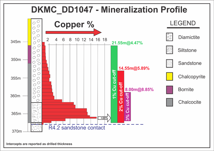 • DD1047 intersected 7.90 metres (true width) of 8.85% copper at a 3.0% copper cut-off beginning at a downhole depth of 359 metres; 8.89 metres (true width) of 8.17% copper at a 2.5% copper cut-off; 14.37 metres (true width) of 5.89% copper at a 2.0% copper cut-off; and 21.28 metres (true width) of 4.47% copper at a 1.0% copper cut-off.