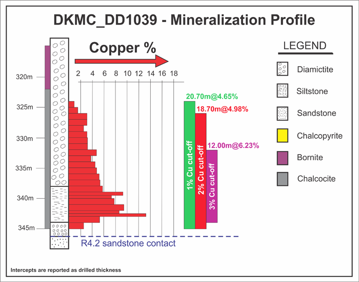 • DD1039 intersected 11.91 metres (true width) of 6.23% copper at a 3.0% copper cut-off beginning at a downhole depth of 332 metres; 17.87 metres (true width) of 5.08% copper at a 2.5% copper cut-off; 18.56 metres (true width) of 4.98% copper at a 2.0% copper cut-off; and 20.55 metres (true width) of 4.65% copper at a 1.0% copper cut-off.