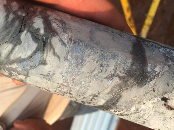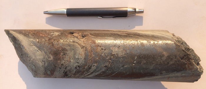 Figure 1.Drill core from DD1041 with disseminated chalcocite in diamictite at a depth of 619 metres (chalcocite is approximately 80% copper by weight).