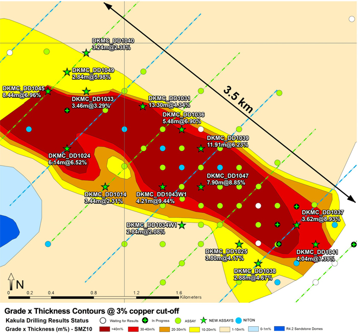 Figure 5. Kakula Discovery Area. Drill-hole location plan for the Kakula Area shows holes completed and in progress, superimposed on 1% composite grade thickness contours.