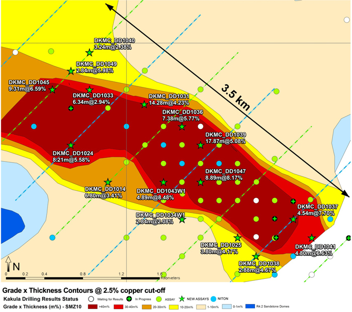 The consistent, bottom-loaded nature of Kakula mineralization supports the creation of selective mineralized zones at cut-offs of between 1.0% and 3.0% copper, and potentially higher. The recent assay results are shown at various cut-offs in Table 1, while the accumulation of copper and thickness of mineralized intercepts at 1.0%, 2.5% and 3.0% cut-offs are shown in figures 5 through 8.