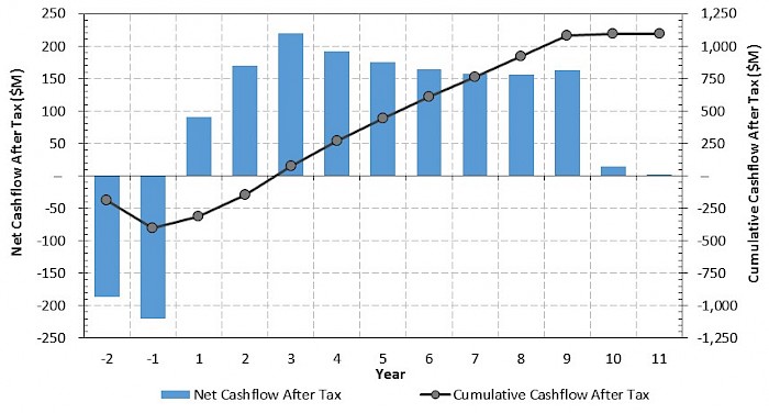 - After-tax net present value (NPV) at an 8% real discount rate is $533 million.