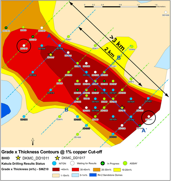 Figure 4: Kakula Discovery Area. Drill-hole location plan for the Kakula Area shows holes completed and in progress, superimposed on 1% composite grade thickness contours.