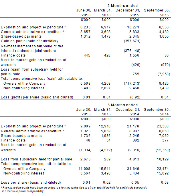 The company’s total comprehensive loss for Q2 2016 of $10.1 million was $4.5 million lower than for the same period in 2015 ($14.6 million). The decrease mainly was due to a $6.9 million increase in finance income, which included mainly interest earned on loans to the Kamoa joint venture that amounted to $3.8 million and deemed income on the purchase price receivable from the partial sale of the Kamoa Project that amounted to $2.9 million.