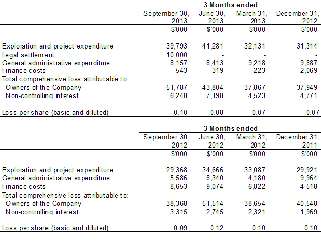 The company’s total comprehensive loss for Q3 2013 was $16.4 million higher than for the same period in 2012. The increase mainly was due to a $10.4 million increase in exploration and project expenditure, as well as the legal settlement expense of $10.0 million recognized in Q3 2013.