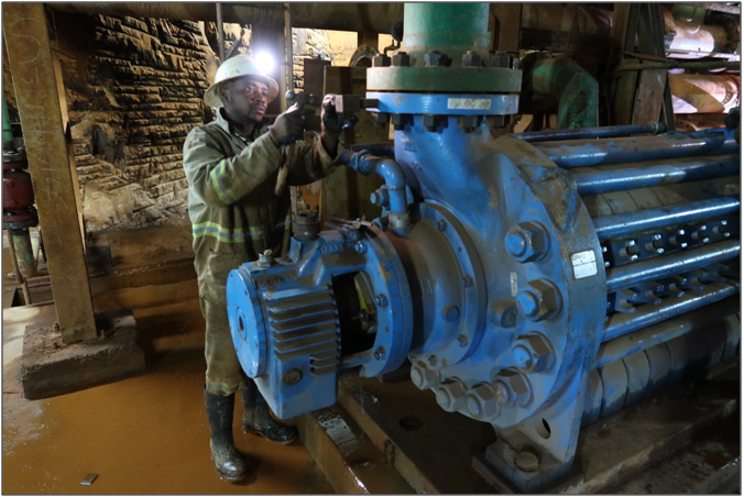 Since completion of the drilling program, water levels have been lowered to approximately the 1,245-metre-level in Shaft 5. Engineering work has focused on upgrading of Shaft 5 conveyances and infrastructure, cleaning the shaft bottom to facilitate the installation of new hoist ropes, repairs and upgrades to the hoisting infrastructure and cleaning and stripping of the main pump station at the 1,200-metre-level.