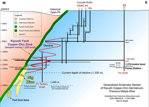 All of the results of the Kipushi 2016 PEA represent forward-looking information and statements. Other statements in this news release that constitute forward-looking statements or information include, but are not limited to: (1) statements about the goal of preparing the Kipushi Mine for the restart of commercial production; (2) statements regarding the mine has the potential to be one of the largest and lowest-cost zinc producers, also while producing significant quantities of copper, silver and germanium; (3) statements regarding the rock hoisting winder will have a potential annual hoisting capacity of 1.8 million tonnes per annum and is expected to be fully operational later in 2017; (4) statements regarding the planned mining methods and access for the Big Zinc Deposit; (5) statements regarding the Big Zinc is expected to be accessed via the existing decline and without any significant new development and that the main levels are planned to be at 60-metre vertical intervals, with sublevels at 30-metre intervals; (6) statements regarding process water from the underground dewatering operations is expected to provide adequate water for processing and mining operations; (7) statements regarding projected steady-state production of 530,000 tonnes of zinc concentrate per annum; and (8) statements regarding the re-commissioning of the Shaft 5 main pumping station, load-out facilities, and main haulage way at the 1,150-metre level.