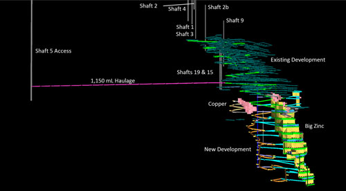 The critical path for the redevelopment of the mine runs through the upgrading of the Shaft 5 rock-hoisting winder, as well as the re-commissioning of the main pumping station at Shaft 5, the underground crusher at the bottom of Shaft 5, the Shaft 5 rock load-out facilities and the restoration of the main haulage way on the 1,150-metre level between the Big Zinc access decline and Shaft 5 (see Figure 1).