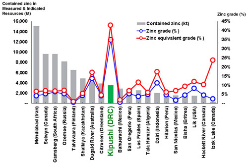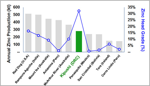 • Life-of-mine average planned zinc concentrate production of 530,000 dry tonnes per annum (tpa), with a concentrate grade of 53% zinc, is expected to rank Kipushi, once in production, among the world’s major zinc mines (see Figure 3, below).