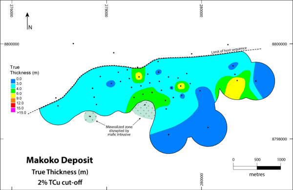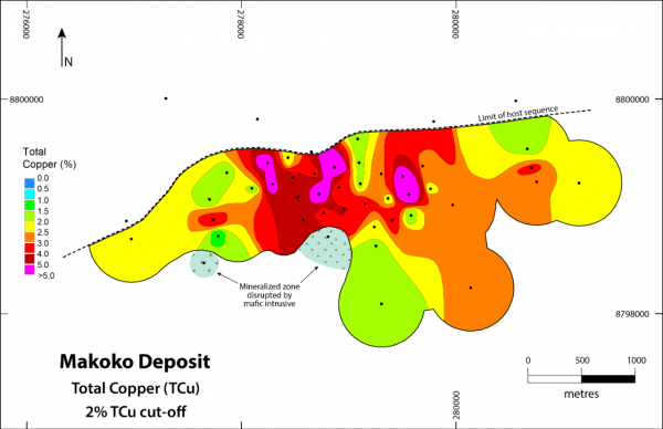 The mineralized zone at Makoko strikes approximately south-southeast. It has been tested over a strike length of 4.5 kilometres and a dip extent of between one and two kilometres. Copper mineralization remains open both along strike and down dip.
