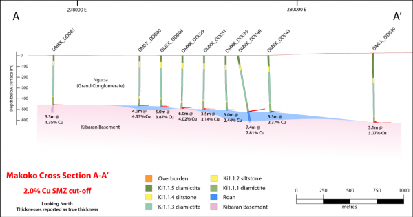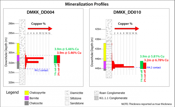 - DD004 (the Makoko discovery hole) intersected 3.94 metres (true width) of 5.46% copper, at a 2.0% copper cut-off, and 3.94 metres (true width) of 5.46% copper at a 1.0% copper cut-off, from a downhole depth of 306 metres.