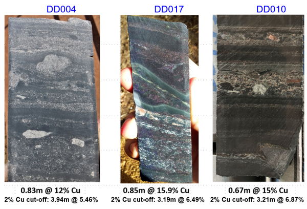 - DD017 intersected 3.19 metres (true width) of 6.49% copper at a 2.0% copper cut-off, and 4.64 metres (true width) of 4.88% copper, at a 1.0% copper cut-off, from a downhole depth of 471.7 metres.