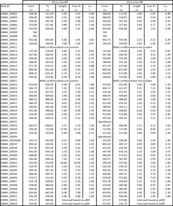 Table 1 on page 13 contains a complete list of assay results, at 1% and 2% copper cut-offs, for the drill holes completed to date at Makoko.