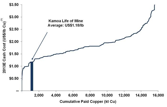 Average cash costs of US$1.18 per pound of copper (after sulphuric acid credit), over the life of the mine, rank the Kamoa Project near the bottom of the 2013 cash-cost curve for copper mines globally.