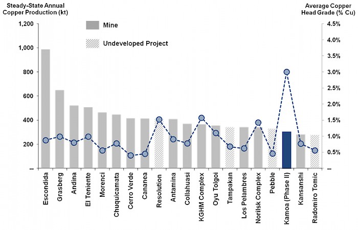 Figure 1: Annual copper production for top 20 mines and undeveloped projects globally.