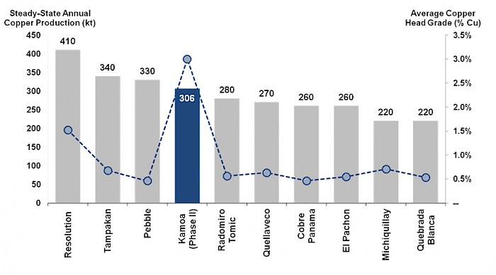 Steady-state production from Year 6 onward of 306,000 tonnes per year of blister copper would establish the Kamoa Project as one of the world’s largest copper mines. Kamoa also would have the highest average grade among the 20 largest copper mines currently in production or expected to be in production, according to data from Wood Mackenzie, an international industry research and consulting group.