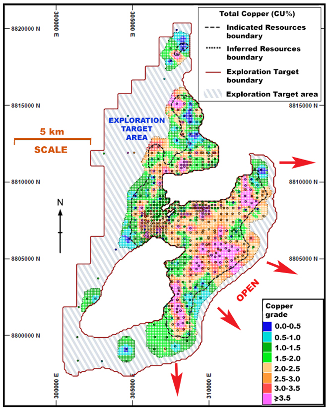 The area inside the model perimeter surrounding the Indicated and Inferred Mineral Resources is considered an exploration target. The ranges of the exploration target tonnages and grades are summarized in Table 6.
