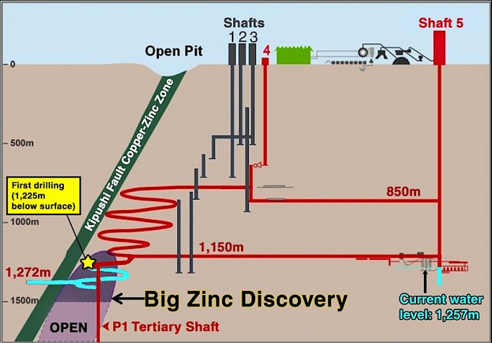 Figure 1: Kipushi cross-section, showing current water level and unmined Big Zinc Discovery.