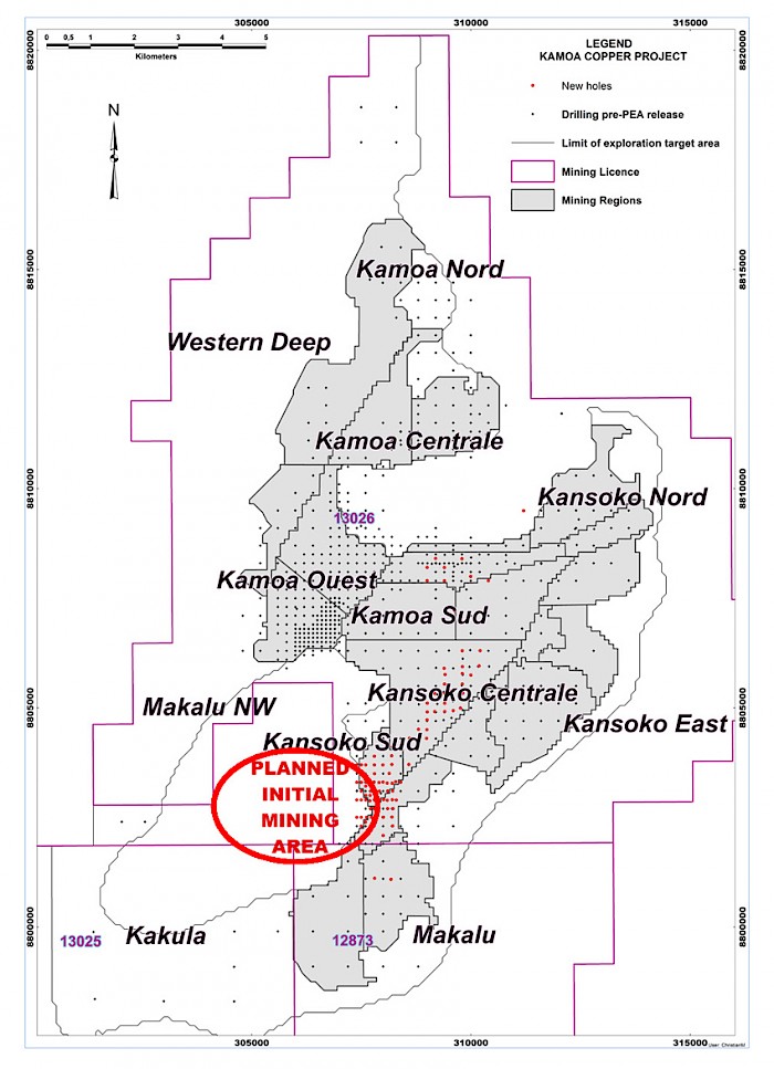 Figure 1: Kamoa proposed mining panel layout by mining section showing the planned initial mining area at Kansoko Sud.
