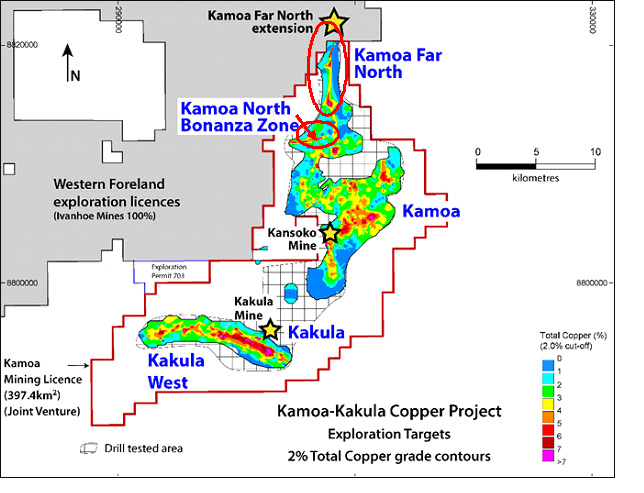 - The controlling east-west striking structure thought to be responsible for the massive copper sulphide mineralization in the Kamoa North Bonanza Zone is visible as a lineament on airborne magnetic images and can be traced over a distance of up to 20 kilometres. It trends west onto the adjacent Western Foreland exploration licences that are 100%-owned by Ivanhoe Mines.