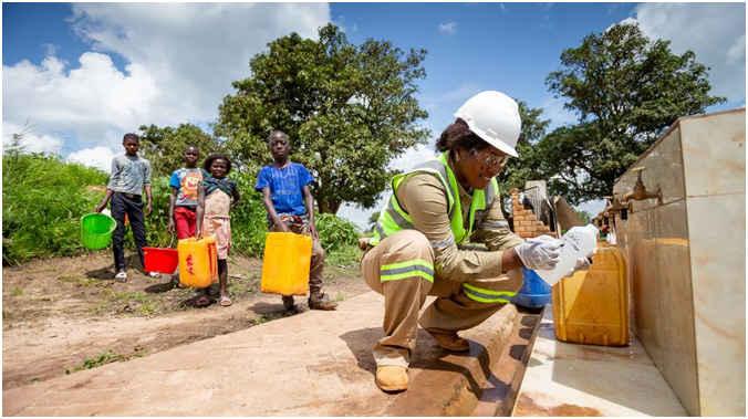Mushiya Kalonji Huguette, an environmental laboratory technical trainee at Kamoa-Kakula, takes a water sample from newly-installed fresh water taps in the local village of Israel. Supplying clean, fresh drinking water to people living in the small, rural villages near Kamoa-Kakula is a key part of the project’s Sustainable Livelihoods Program.
