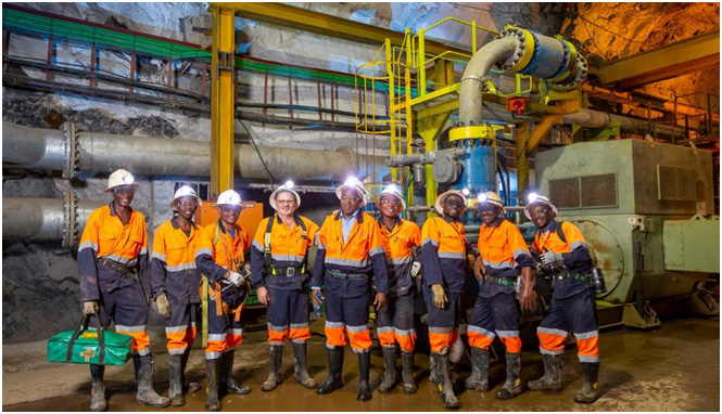 Kipushi’s construction team assisting in civil works for the new 850-metre-level pumping station that will significantly reduce power consumption and electricity costs during production. From left to right: K. Mudikike, M. Kalula, K. Mukendi, G. Graham, P. Dikwenda, K. Nyandwe, M. Ngoyi, M. Mutomb, E. Ditend.
