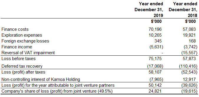 The company’s share of losses from the Kamoa Holding joint venture was $24.8 million for the year ended December 31, 2019, compared to a profit of $19.6 million for the same period in 2018, the breakdown of which is summarized in the following table: