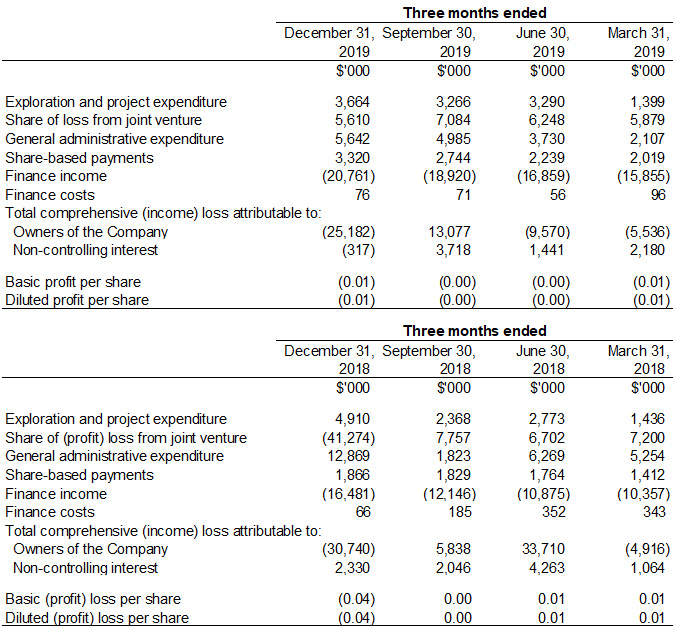 The following table summarizes selected financial information for the prior eight quarters. Ivanhoe had no operating revenue in any financial reporting period and did not declare or pay any dividend or distribution in any financial reporting period.