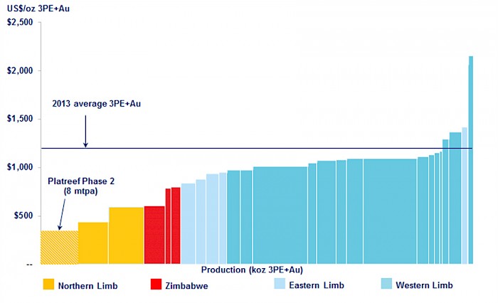 - Platreef, with the highest concentration of base metals among Africa’s platinum-group metals producers, would rank at the bottom of the cash-cost curve, at an estimated US$341 per ounce of 3PE+Au, net of by-products.