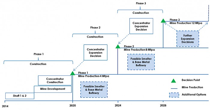 Phase 1 would include the construction of a concentrator and other associated infrastructure to establish an operating platform to support the start of production at a nominal plant capacity of 4 Mtpa by 2020. Phase 2 includes a ramp-up to a plant capacity of 8 Mtpa by 2024; Phase 3 envisages a further ramp-up to a steady-state plant capacity of 12 Mtpa by 2028.