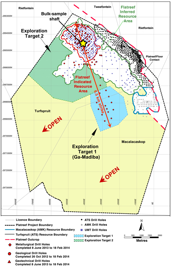 Target 1, the Ga-Madiba extension zone, is based on results from 14 wide-spaced, step-out drill holes completed between October 26, 2012, and February 18, 2014. Ga-Madiba, which adjoins and stretches to the south from the area where Inferred Mineral Resources are estimated, could contain 115 to 235 million tonnes grading 3.1 to 4.5 g/t 3PE+Au (comprising 1.2 to 1.7 g/t platinum, 1.7 to 2.3 g/t palladium, 0.06 to 0.14 g/t rhodium, 0.17 to 0.26 g/t gold), 0.23% to 0.28% nickel and 0.11% to 0.14% copper over an area of 3.7 square kilometres. The tonnage and grade ranges are based on intersections of 2.0 g/t 3PE+Au mineralization in drill holes completed in Target 1.