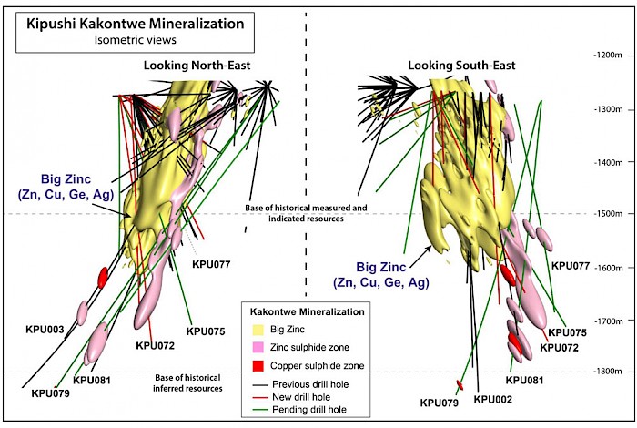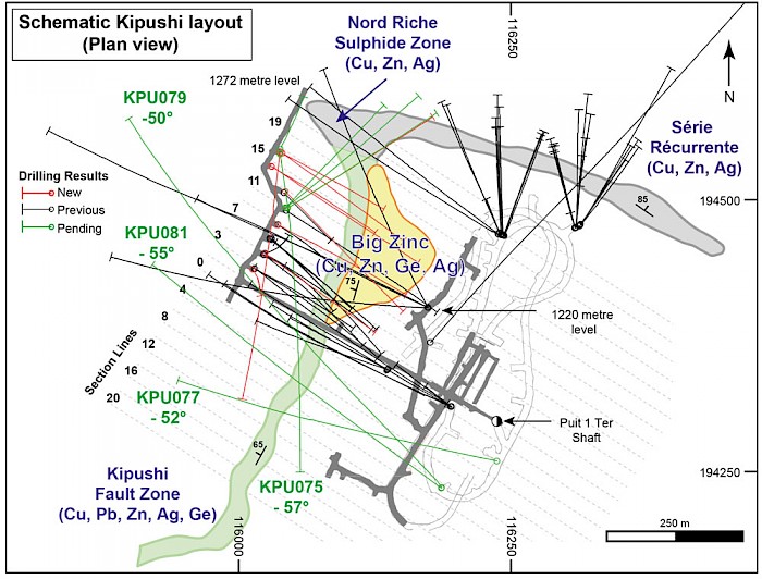 New drilling also establishes the presence of copper and zinc sulphide zones at depth significantly below the level of the historical holes drilled by state-owned mining company Gécamines, confirming that the Kipushi mineralizing system remains open at depth.