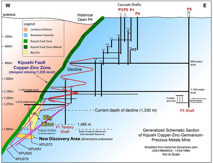 Figure 1: Schematic Kipushi cross-section showing mine infrastructure, the Big Zinc and Kipushi Fault zones, and the new discovery area below the Big Zinc.