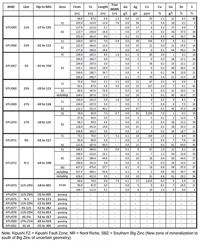 • KPU072: 57.7 metres, drilled length, grading 37.0% zinc, 0.6% copper and 6 g/t silver and 54 g/t germanium including an interval of 50.8 metres grading 40.7% zinc, 0.6% copper, 6 g/t silver and 54 g/t germanium.