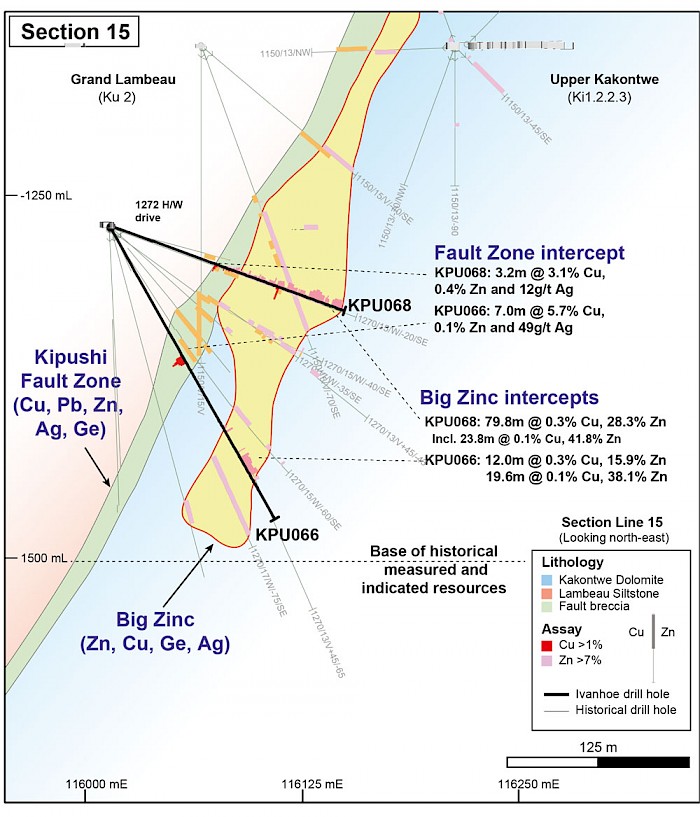 Figure 3: Drill section 15 containing confirmation drill holes KPU066 and KPU068 through the Big Zinc zone.