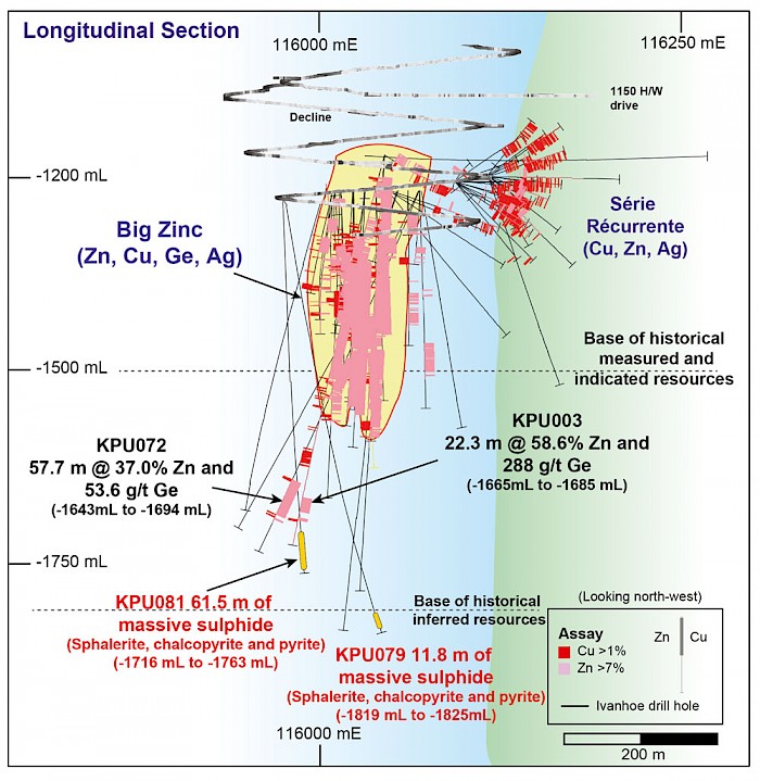 Assay results received for drill hole KPU072 have confirmed a high-grade zone of zinc mineralization exists at depth to the south of the historically defined Big Zinc zone. Follow-up drilling by Ivanhoe confirms the initial massive sphalerite discovery and suggests a geometry and orientation similar to the Big Zinc zone.