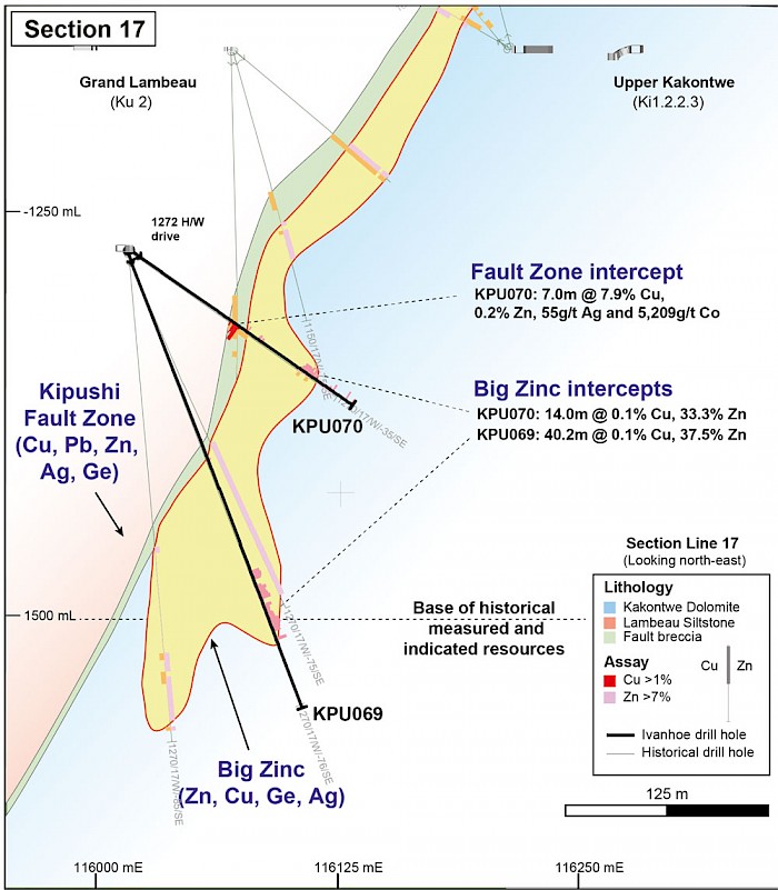 • KPU070 drilled on section line 17: 6.7 metres true thickness grading 7.9% copper, 0.2% zinc, 55 g/t silver and 0.52% cobalt.
