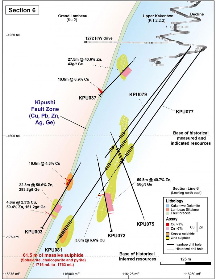 • KPU071 drilled on section line 9: 85.0 metres, drilled length, grading 49.0% zinc, 0.3% copper, 12 g/t silver and 61 g/t germanium.