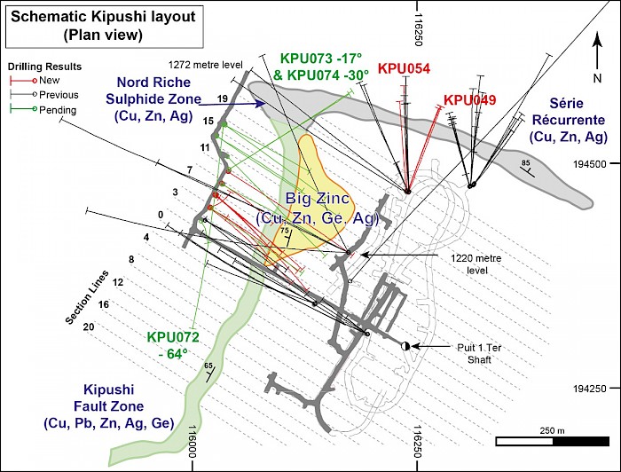 - KPU049 (Série Récurrente zone): 9.7 metres true thickness grading 11.8% copper, 6.0 % zinc and 73.0 g/t silver, including a higher grade intercept of 6.4-metre true thickness grading 16.8% copper, 7.7% zinc, 104 g/t silver.