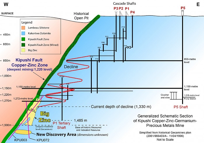 Figure 1: Schematic Kipushi cross-section showing mine infrastructure, the Big Zinc and Kipushi Fault zones, and the new discovery area below the Big Zinc.