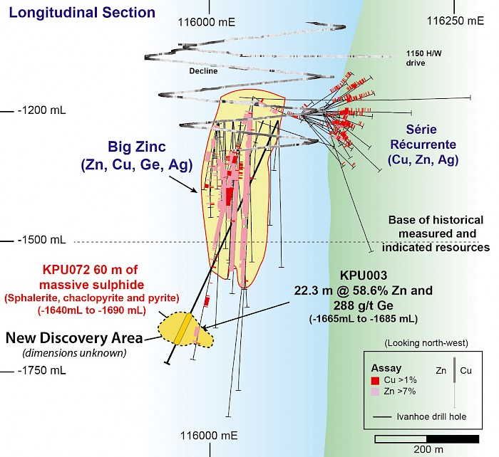 KPU072 is the second hole to successfully intersect Big Zinc-style massive sulphides at depth. The first, KPU003, intersected a zone of massive sulphides approximately 180 metres below the historical measured and indicated resources and 130 metres west from the new KPU072 intercept. The KPU003 intersection returned a previously reported 58.6% zinc and 293.8 g/t germanium over 22.3 metres. Holes KPU003 and KPU072 are shown in Figure 5 and a photograph of the intersection is shown in Figure 6.