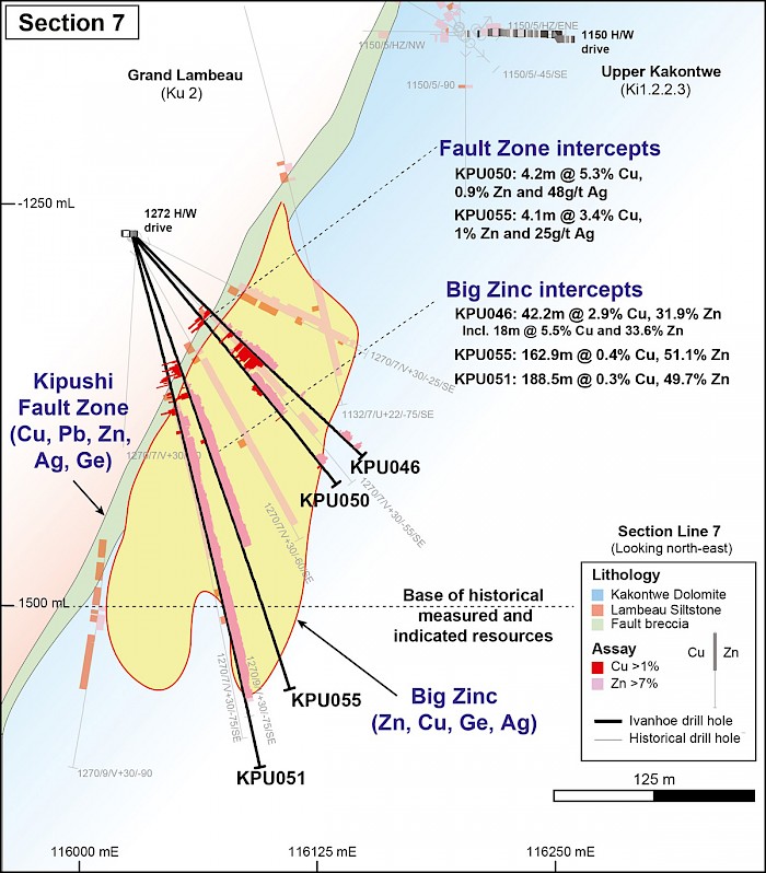 - KPU055 drilled on section line 7: 162.9 metres grading 51.1% zinc, 0.4% copper, 11 g/t silver and 59 g/t germanium.