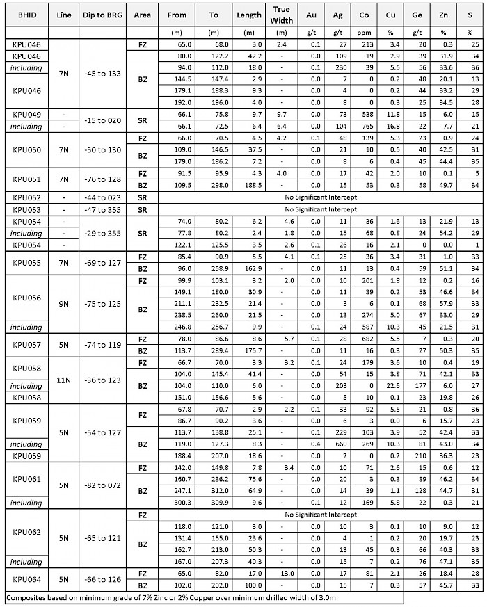 - KPU058 drilled on section line 11: 41.4 metres grading 42.1% zinc, 3.8% copper, 54 g/t silver and 71 g/t germanium, including a copper-rich intercept of 6.0 metres grading 6.0% zinc, 22.6% copper, 203 g/t silver and 177 g/t germanium.
